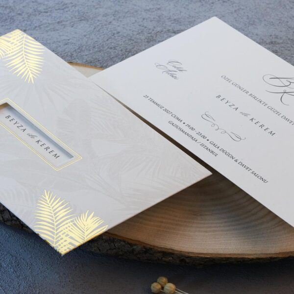 Altın Yaldız Palmiye Yapraklı Pencereli Zarf Davetiye