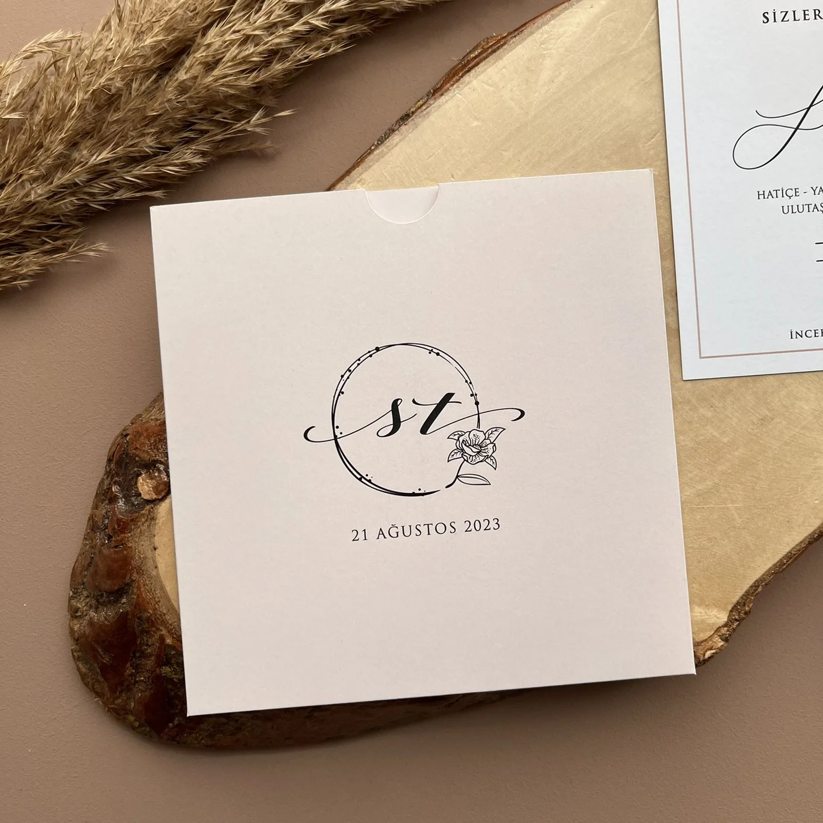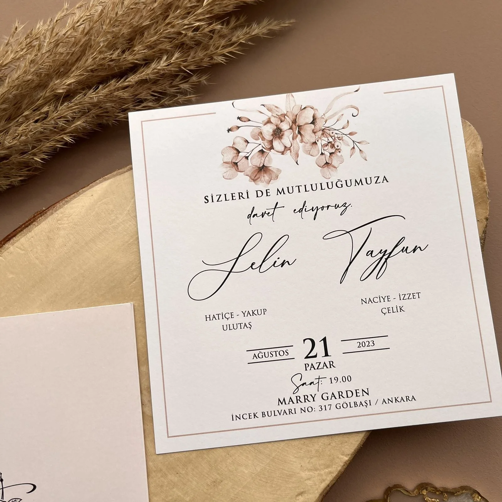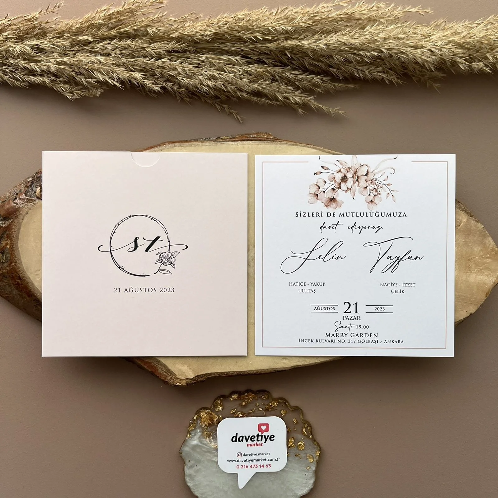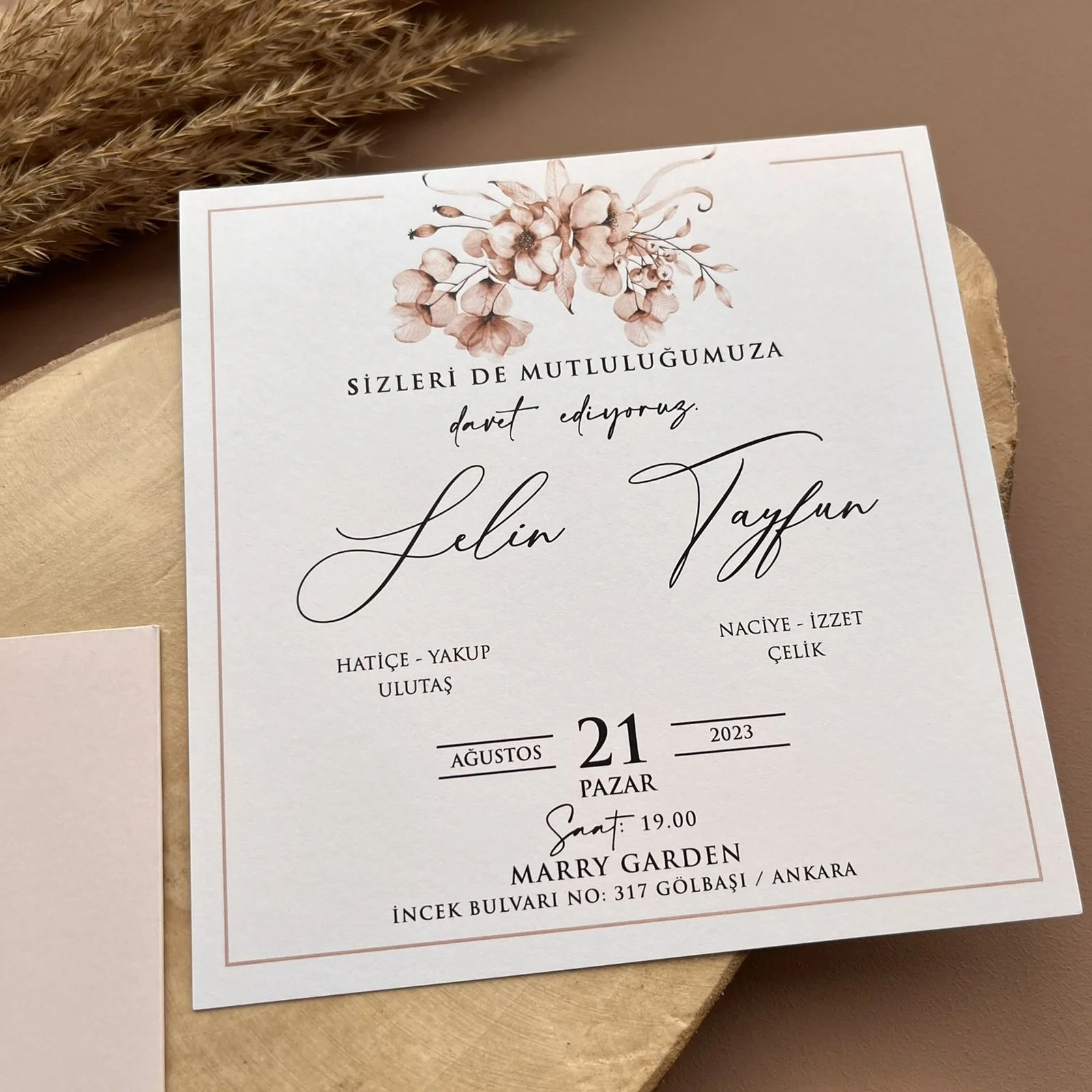 Özel pudra rengi kare zarflı düğün davetiyesi modelimiz. Zarf baskısı olmadan da sipariş verebilir, detaylı bilgi için whatsapp hattımızdan destek alabilirsiniz.