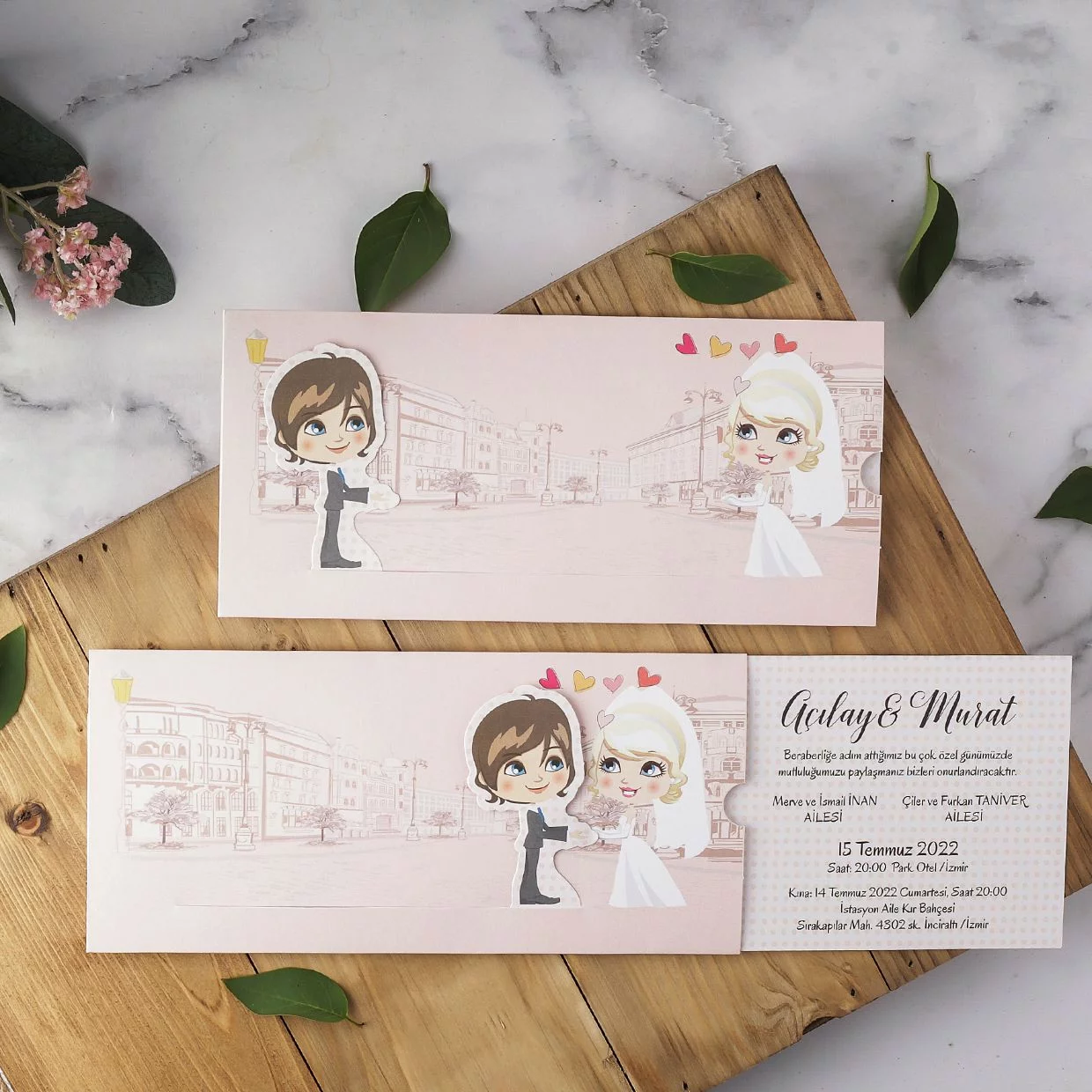 Karikatür detaylı düğün davetiyesi modelimiz, kavuşan çiftleri canlandıran çekerek açılan kaydırmalı davetiye modeli. Üretim Süresi: 6 iş günü