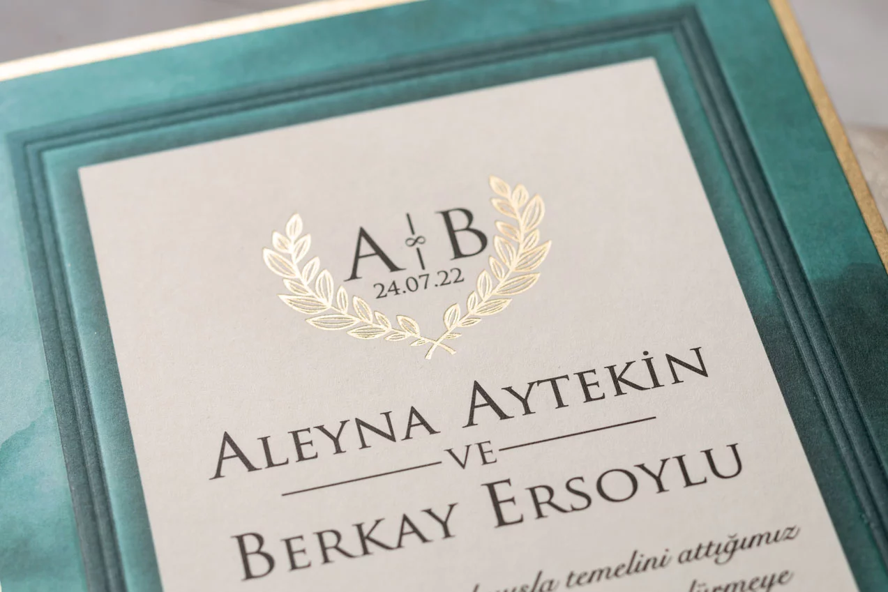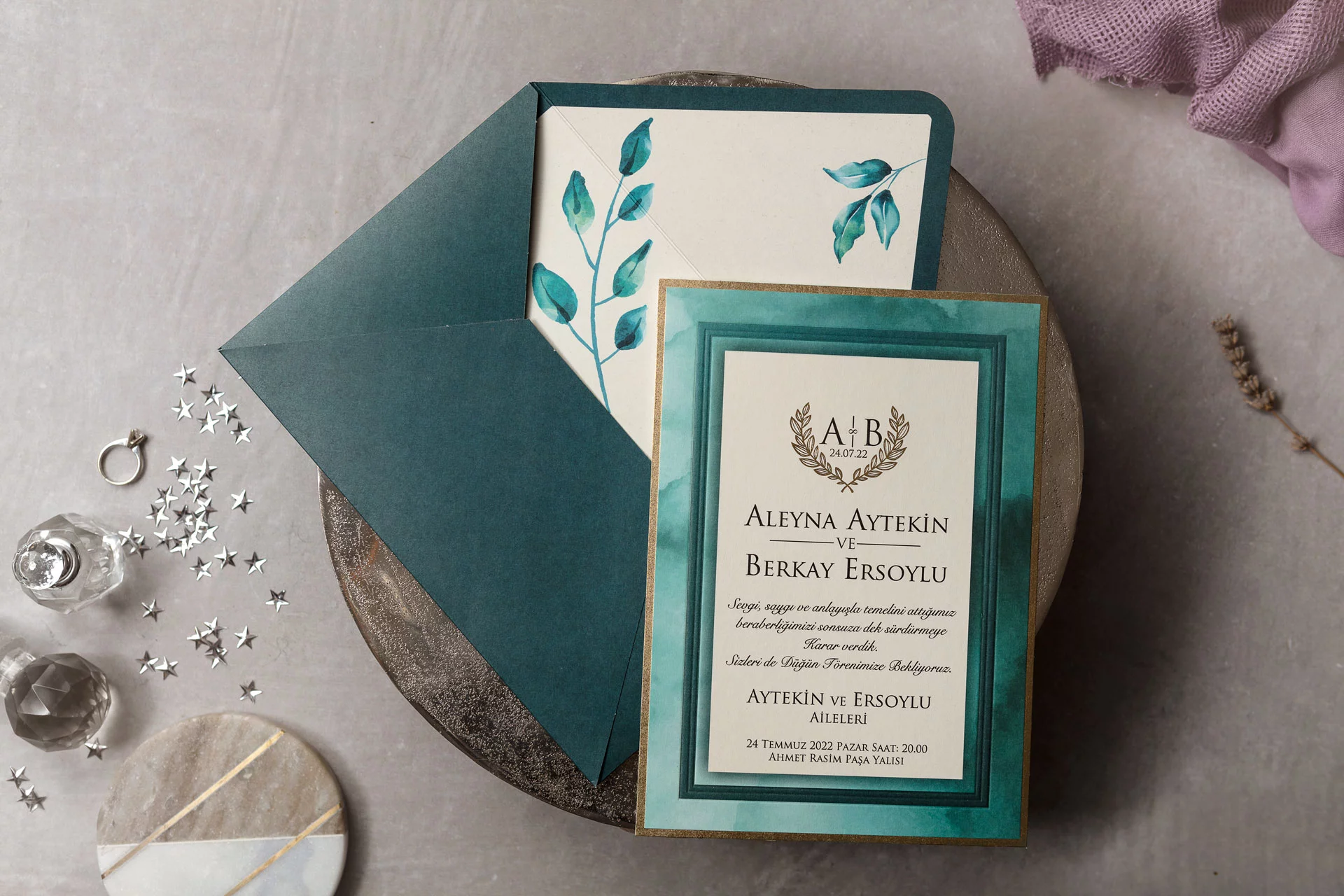 Yeşil tonlarının hakim olduğu, özel zarf ve renk geçişleri ile dikkat çeken davetiye modelimiz. Yaldız ve ofset baskı tekniklerine uygundur.