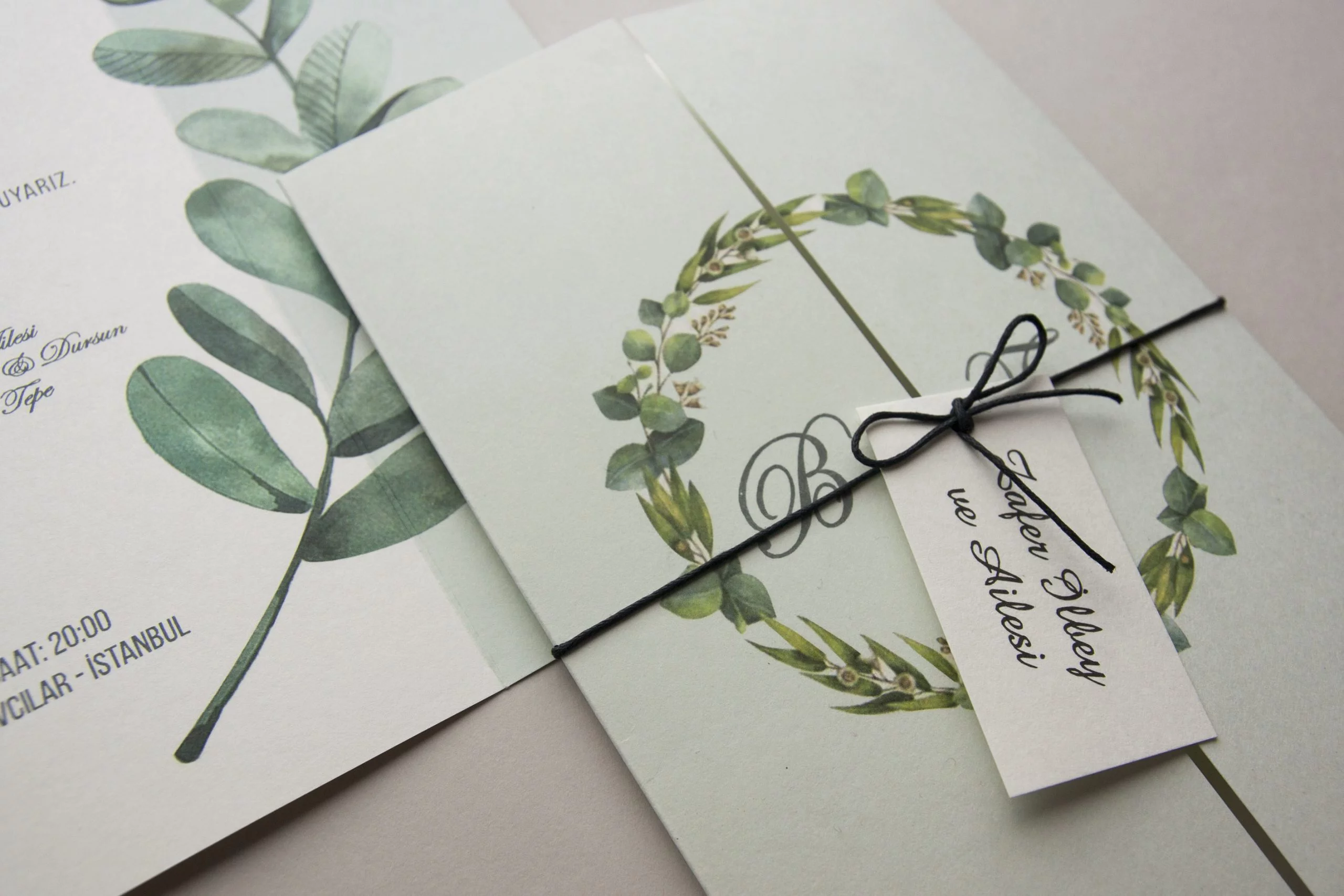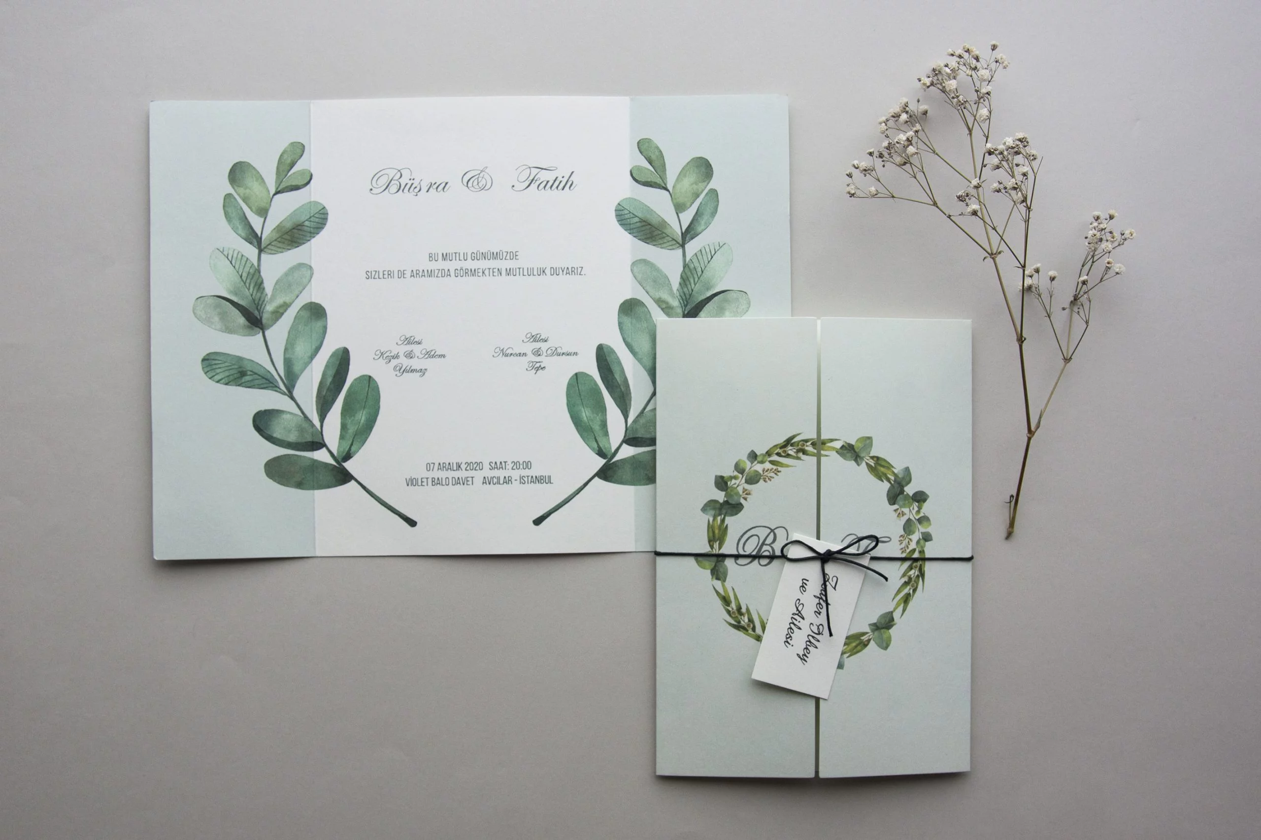 Modern Okaliptus bitkisi ile tasarlanmış sade minimalist tasarım sevenlerin tercihi olabilecek davetiye modelimiz.