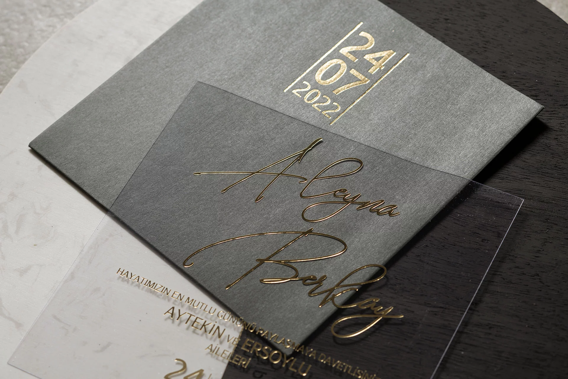 Altın yaldız baskılı şeffaf pvc düğün davetiyesi modelimiz, model üzerinde baskı yöntemleri altın yaldızdır.