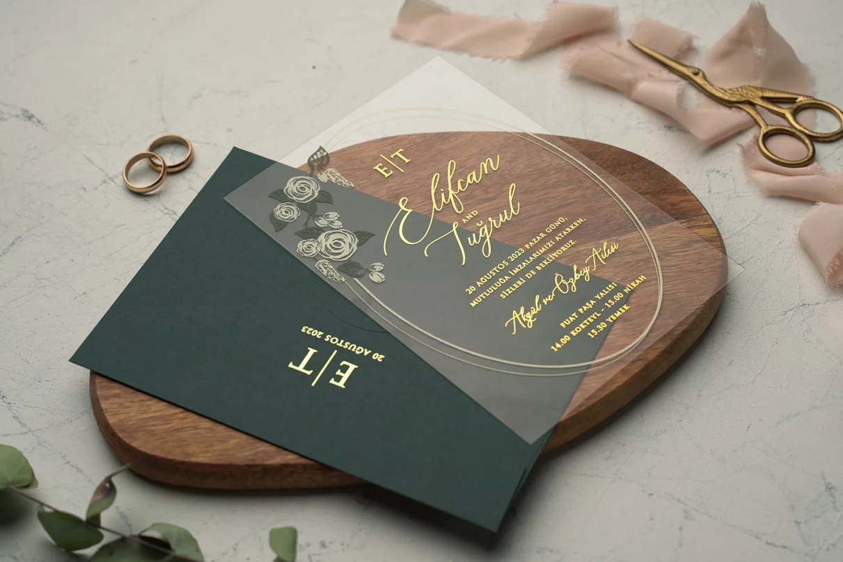 2024 yılının en çok satan düğün davetiyesi, şeffaf iç pvc kısmı ve özel zarfı ile dikkat çekiyor. Örnekte yapılan baskı işlemleri; iç ve zarf altın yaldız baskısıdır.