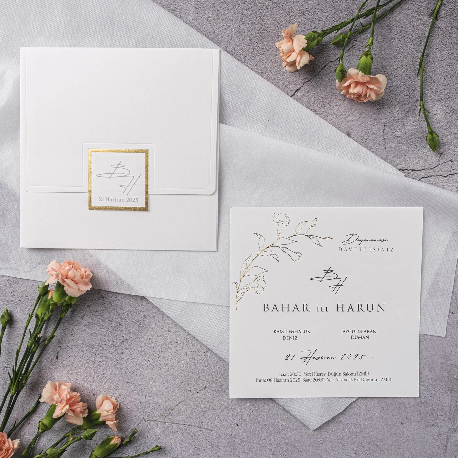 Özel zarflı ve yaldız detaylı sade tasarım düğün davetiyesi modelimiz.